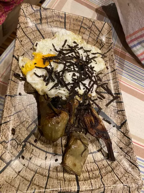 - Por último y para esta receta pasamos las alcachofas por una sartén caliente y las marcamos bien, freímos 2 huevos trufados y servimos en el plato. Por último rallamos trufa por encima sal Maldon y un poco de Aove.